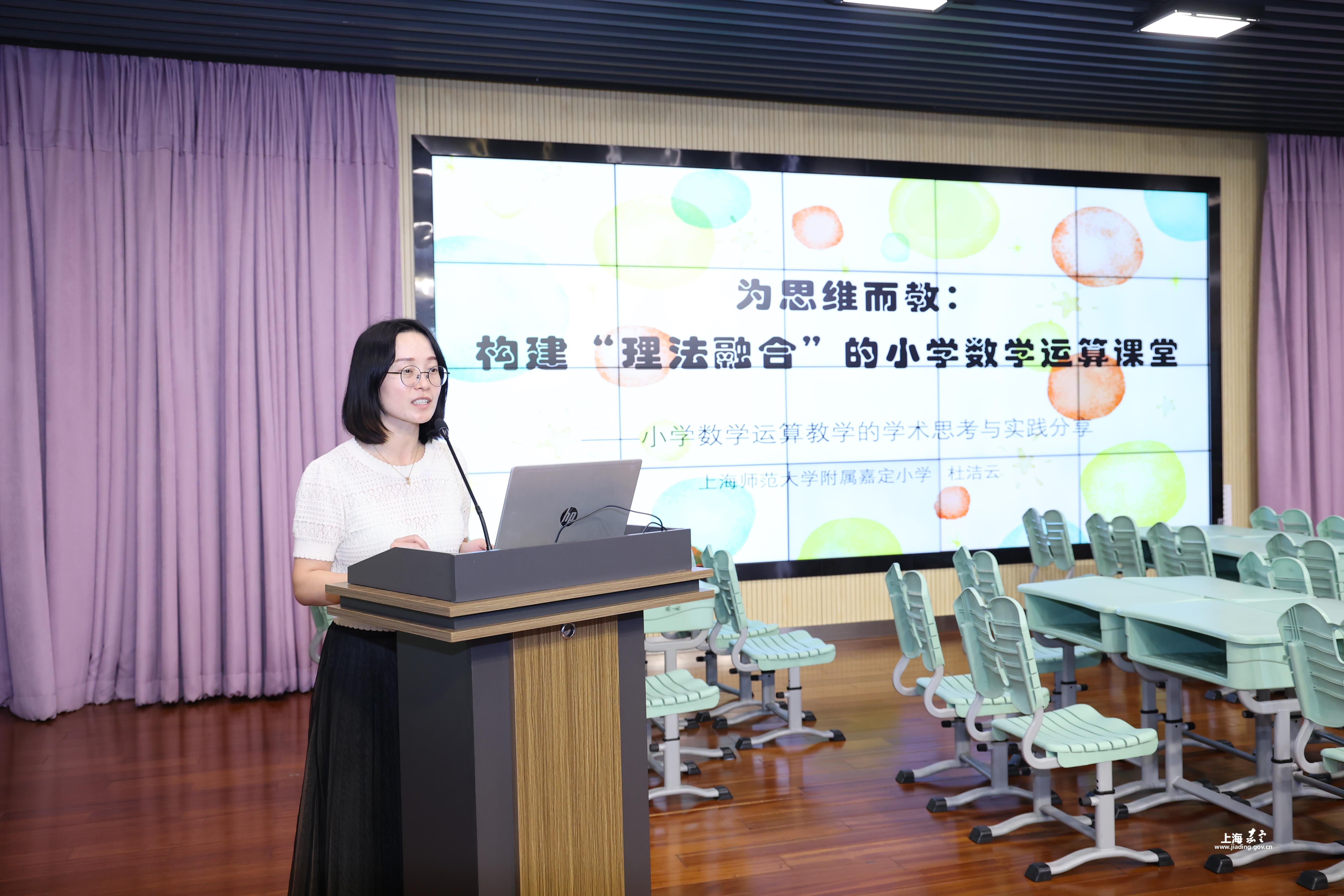上海师范大学附属嘉定小学杜洁云老师围绕“算理与算法如何兼得”这一话题,清晰地阐释算理与算法作为运算能力“一体两翼”的重要。她结合三个教学实例,从二年级退位减法的小棒操作与竖式融合,到三年级两位数乘法的点子图与算法优化,再到五年级小数乘法的方格纸数形结合,生动演绎“理法融合”的课堂是如何在循环往复中实现思维进阶的。