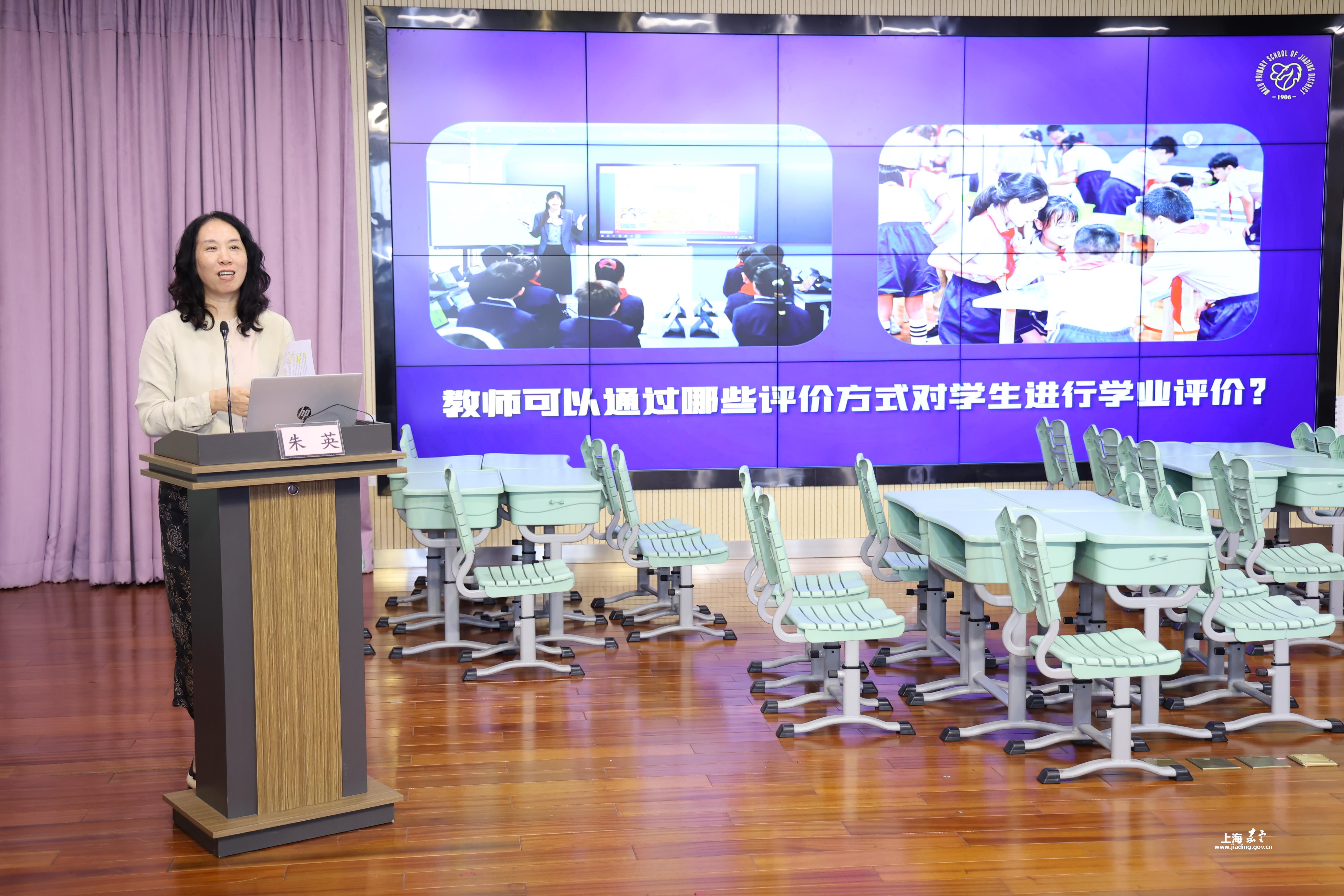马陆小学校长朱英围绕“提高核心素养的小学数学学业述评校本化实践探究”主题,分享马陆小学数学教研组聚焦学生核心素养,构建“数据采集—生成述评—精准教研—协同改进”的闭环评价体系。这一评价体系在评价维度上,突破传统,极具前瞻性与实操性。她的分享为开展精准教研、改进教学打开了思路。