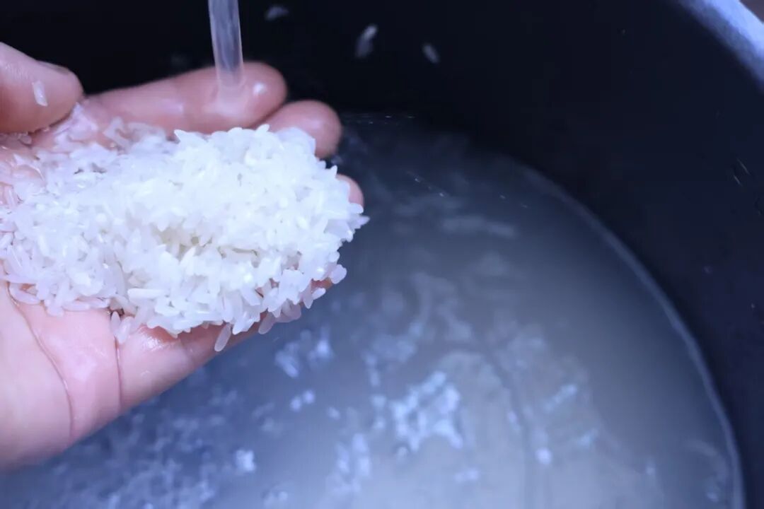 4.米淘洗干净,将炒好的料平铺在米上,倒入适量清水,按煮饭键。