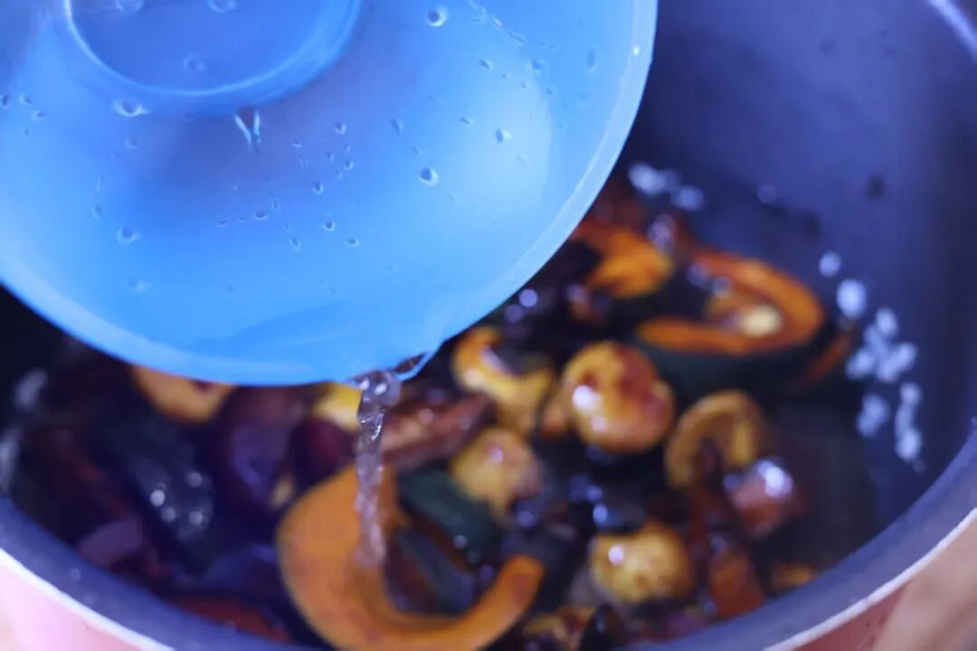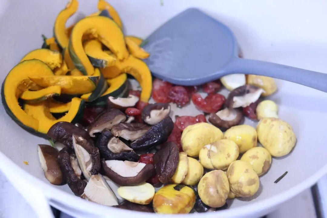 2.倒入南瓜、干香菇、板栗翻炒均匀。