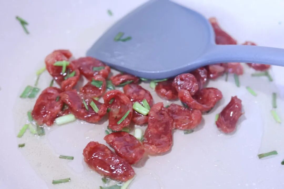 1.锅中倒油,腊肠切片,煸炒出香味。