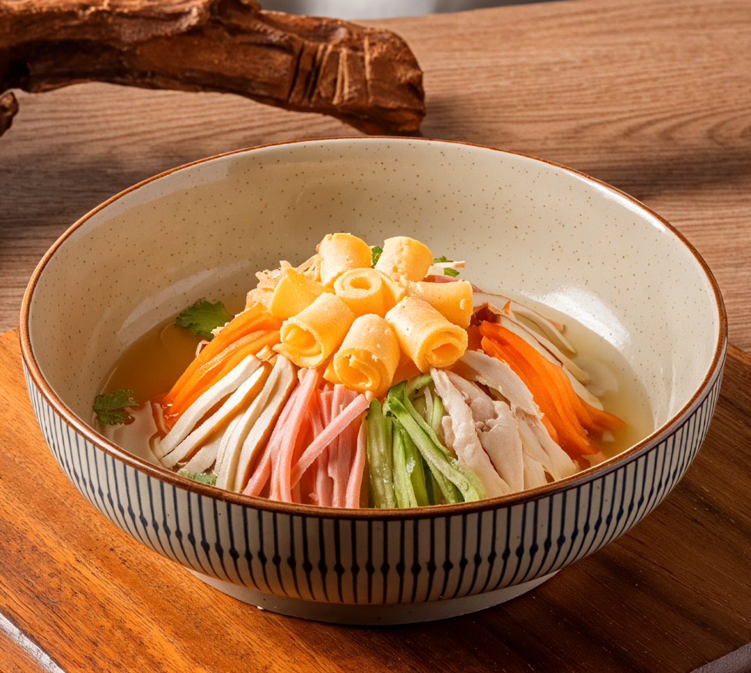 白萝卜500克、鸡腿150克、黄瓜50克、胡萝卜50克、豆干50克、火腿50克、鱿鱼丝30克、香菜5克、鸡蛋2个、淀粉15克、鲜鸡汁调味料16克