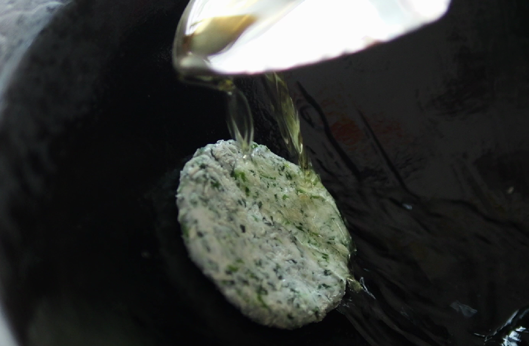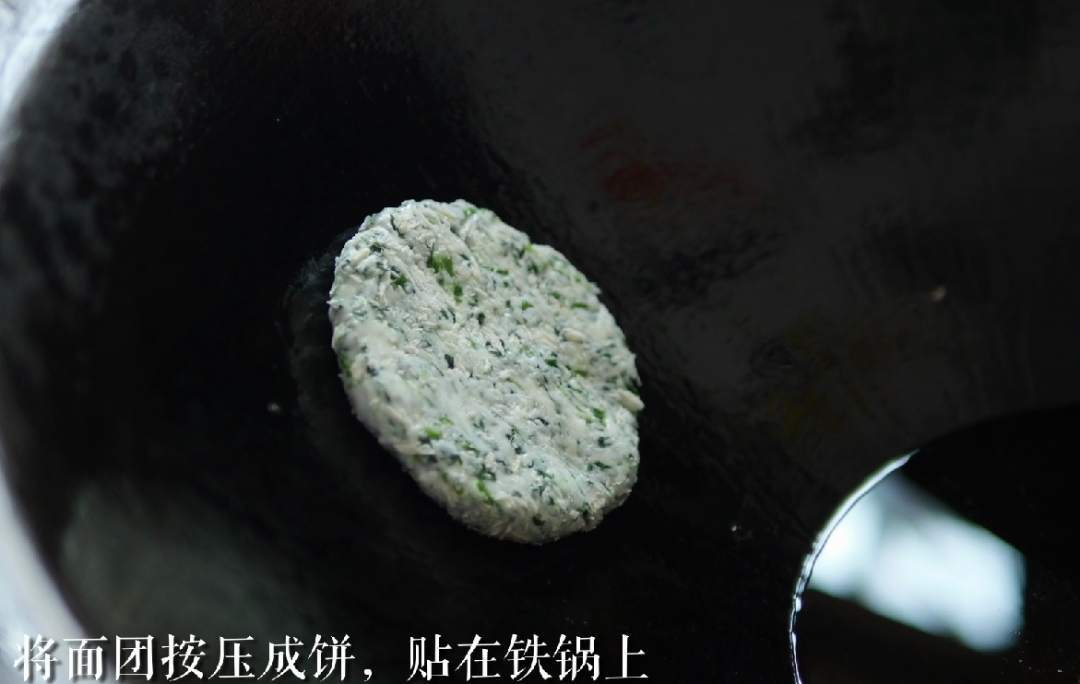 4.将面团按压成饼,贴在铁锅上;将油淋上塌饼上,火候不能过大。