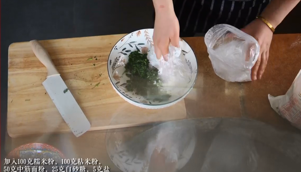 材料:草头、糯米粉、粘米粉、中筋面粉、白砂糖、盐、面包糠