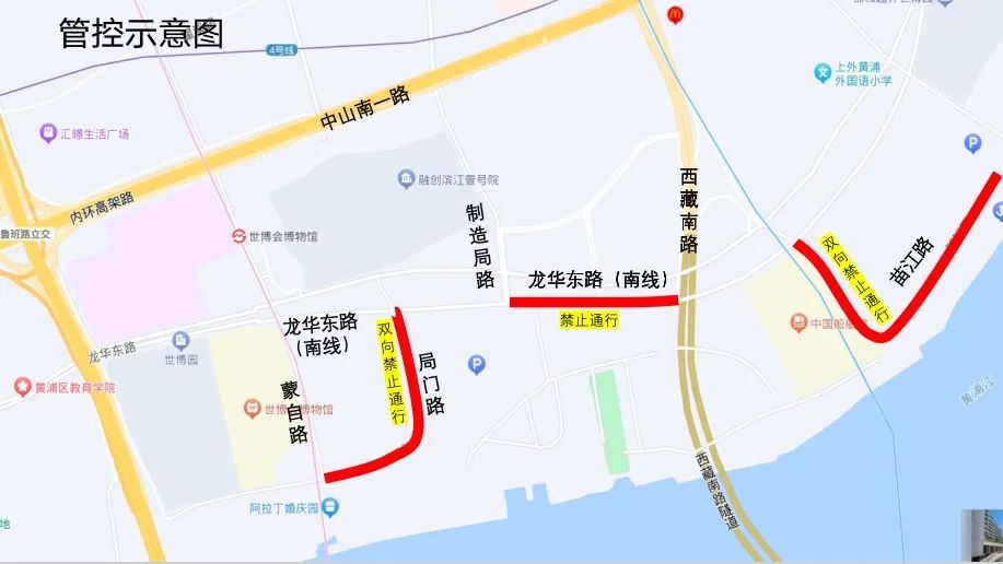 自蒙自路/局门路路口起—龙华东路(不含)—龙华东路(制造局路至西藏南路南侧道路)—苗江路—至苗江路/望达路路口止,组成的范围。