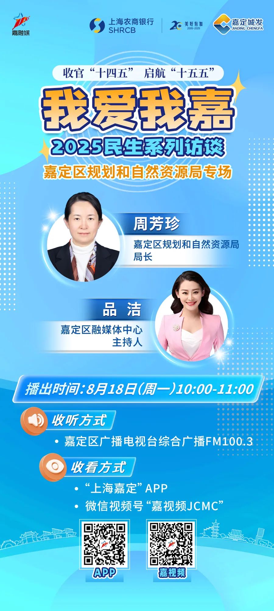 明天(8月18日)10:00,嘉定区规划和自然资源局局长周芳珍将参加“我爱我嘉”2025民生系列访谈,与嘉融媒主持人品洁共同探讨如何更好描绘嘉定城乡规划发展的美好图景?嘉定在空间格局升级中有哪些重要项目和区域正在推进?如何助力产业动能跃升?通过哪些创新治理模式实现共建共治共享?节目将展现“十四五”期间嘉定在增进民生福祉、提升城市人本价值方面的具体实践与显著成效,谋划“十五五”嘉定经济社会发展的思路举措和目标愿景。