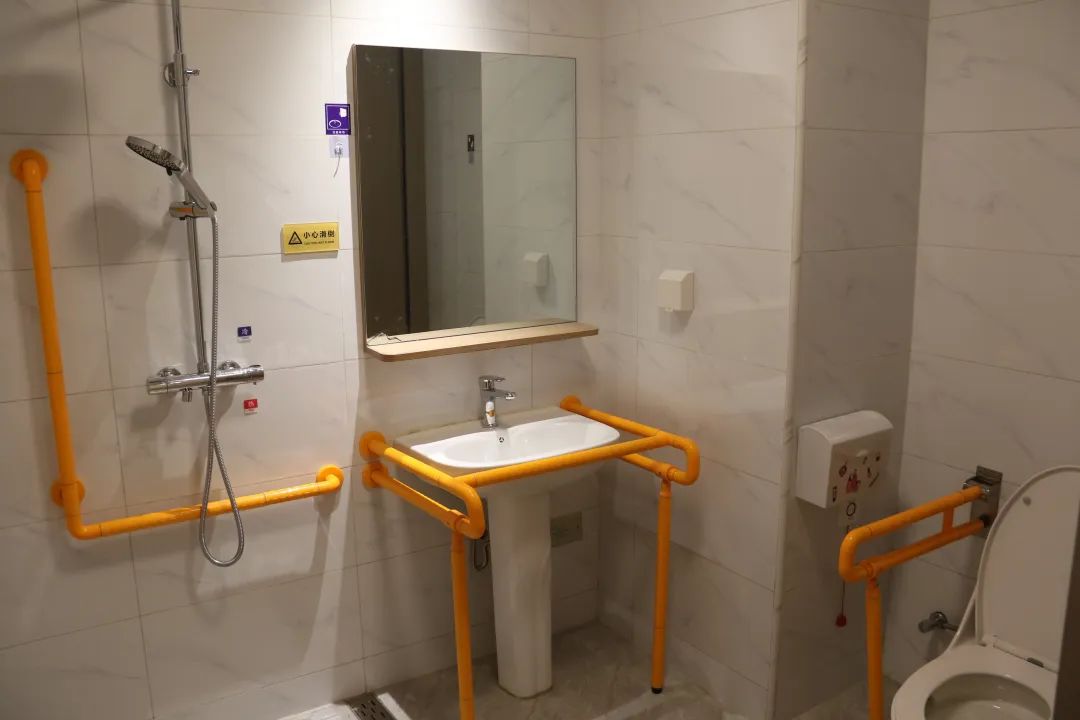 86岁的陆进才坐在多功能休息厅内,一边看电视一边满意地说:“环境很舒适,卫生间浴室都有扶手,非常贴心。”