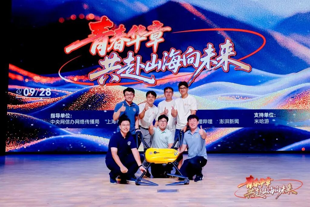 第三篇章“追梦·未来之约”展望未来。青年交警黄俊、上海创智学院和复旦大学联合培养博士生王殿仪、派生万物CEO孙挥以行动诠释“我辈当为、强国有我”的时代担当。上海交大团队研发的海空两栖无人航行器“哪吒”也来到展演现场,三位交大学子以脱口秀形式幽默分享了“哪吒”科研的背后故事,台上台下欢乐互动。当上海交通大学2012届硕士毕业生,米哈游创始人、总裁刘伟的视频出现在大屏幕上时,交大学生一片欢呼。上海京剧院青年演员杨扬演唱的《原神》游戏配曲《神女劈观》,原汁原味的京剧唱腔和二次元的混搭在活动现场掀起一个高潮。