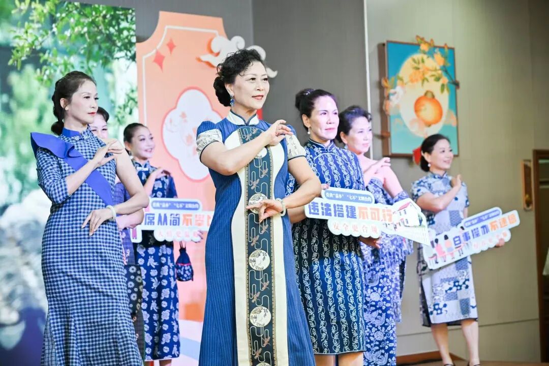 江桥镇新华村村民王阿姨告诉记者,原来药斑布早已不只是蓝白相间那么简单,竟还能做出如此时尚的旗袍,“看旗袍走秀赏心悦目,再看一看‘七不‘文明公约,润物细无声,一起遵守文明新风尚。”