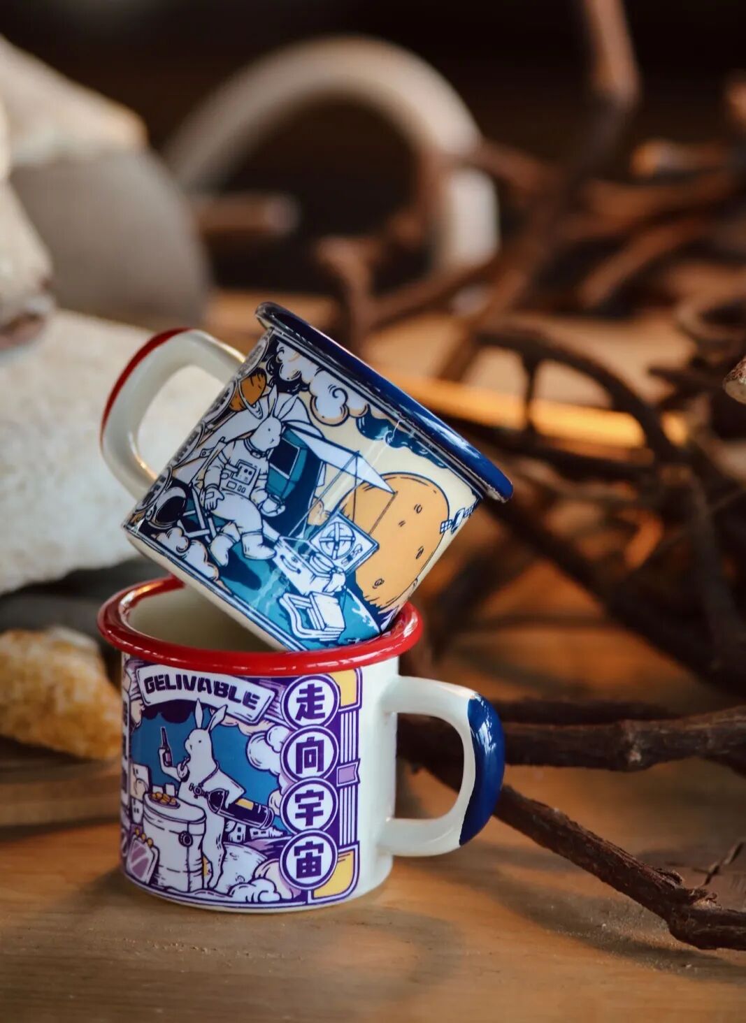 “这次的搪瓷杯我们从材质到工艺都进行了全面升级,就是为了打破大家对传统搪瓷‘易碎、笨重’的固有印象。”搪瓷品牌“玖申”创始人谢贤介绍道,“杯身采用搪瓷专用钢板,厚度由传统的0.2毫米提升到0.6毫米,并且在800℃高温下反复烧制三到四次,经过多道严苛工序,使得成品更坚固耐用,同时还能更好地保留搪瓷的温润质感。”设计上,团队则大胆突破传统搪瓷常见的花卉、口号风格,以充满童趣的版画感趣味插画为载体,结合上海方言与生活化场景,生动打造出“小兔子惬意过中秋”的画面,让每一只搪瓷杯都成为一个可使用、可收藏的节日故事载体。
