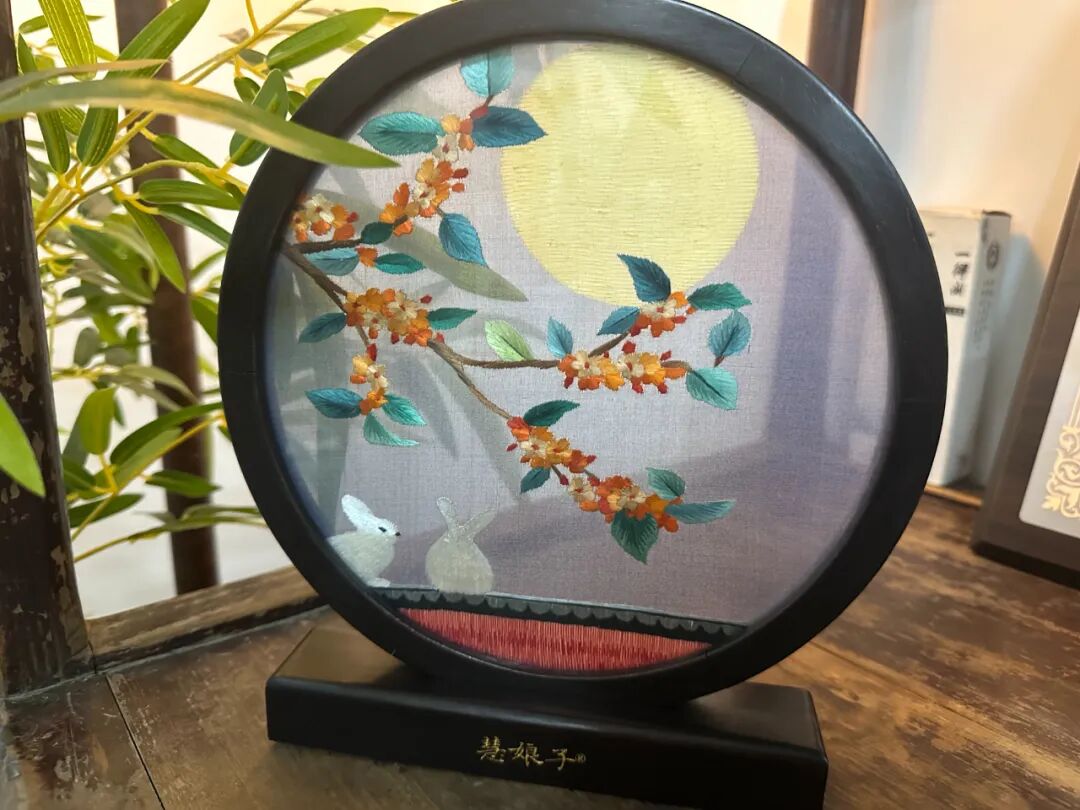 以墨青为底,玉兔、红墙、桂花、圆月等中秋经典元素在绣布上渐次浮现……在慧绣文化空间的绣架前,江南闺绣画非遗代表性传承人范冬梅正轻捻绣针,全神贯注地创作中秋系列的主打作品——“双兔望月”摆台。这个凝聚着闺绣技艺精髓的作品,从设计构思到成品绣制,每一步都融入了对传统节日文化的深度解读。