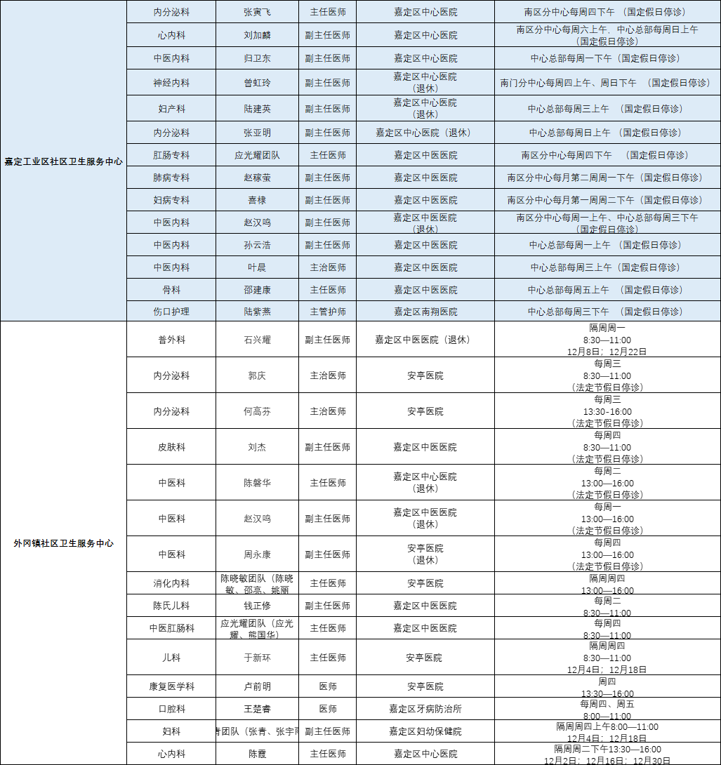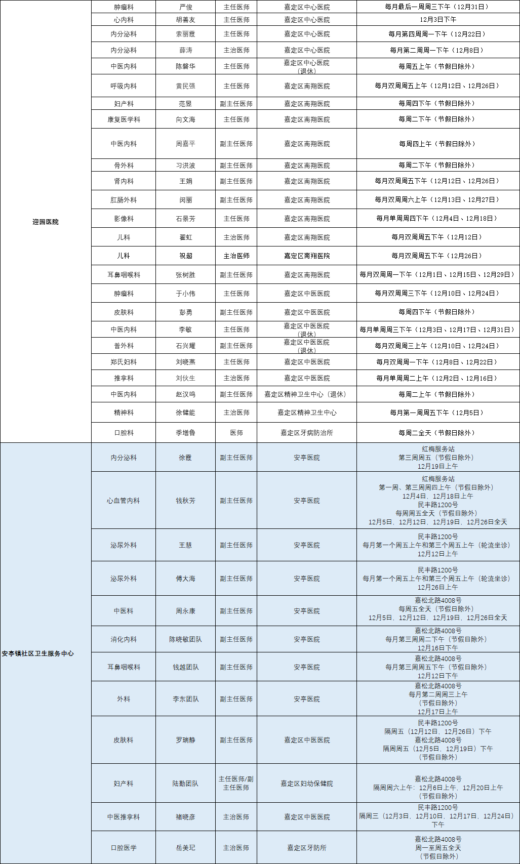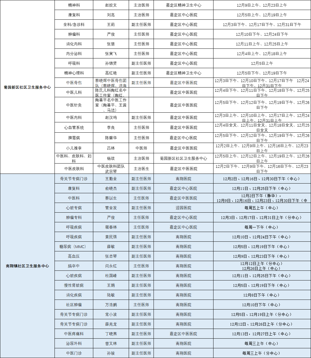 嘉定区各社区医院区级专家12月定期开诊安排出炉