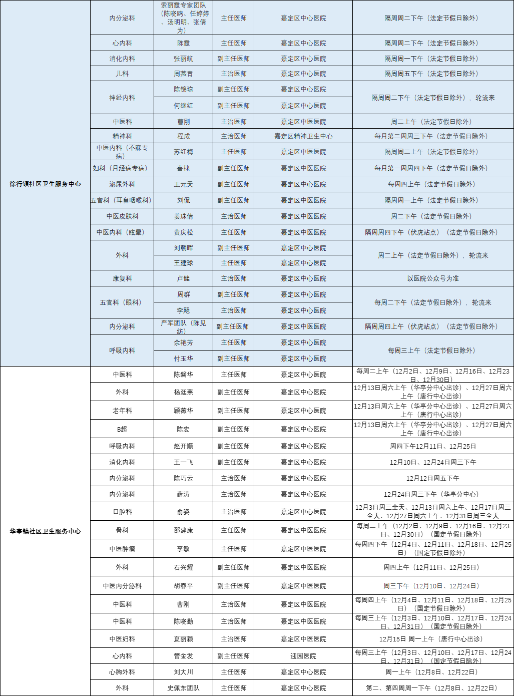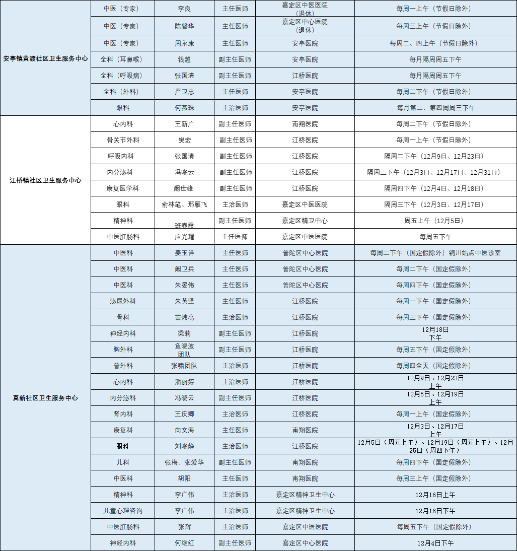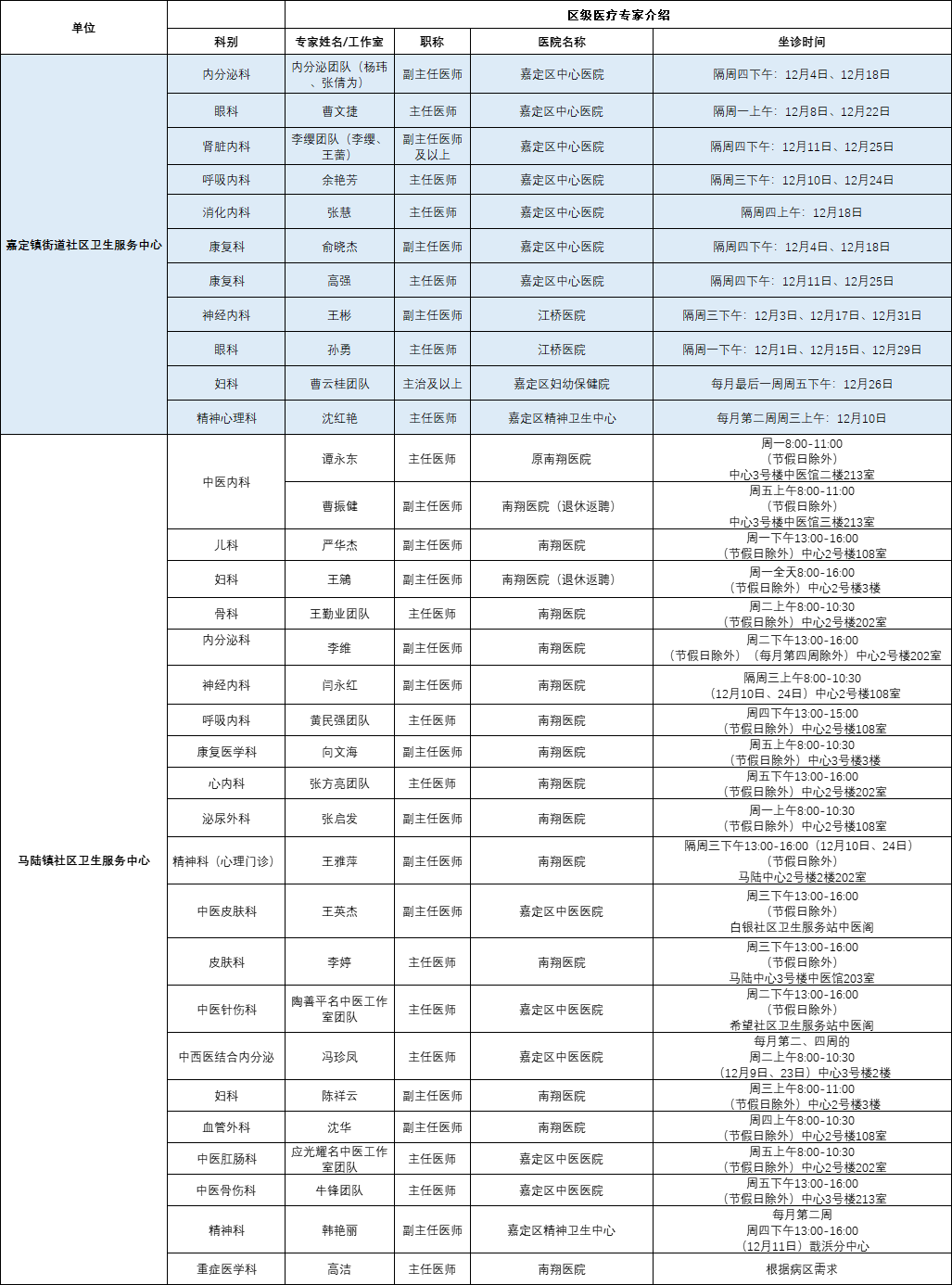 嘉定区各社区医院区级专家12月定期开诊安排出炉