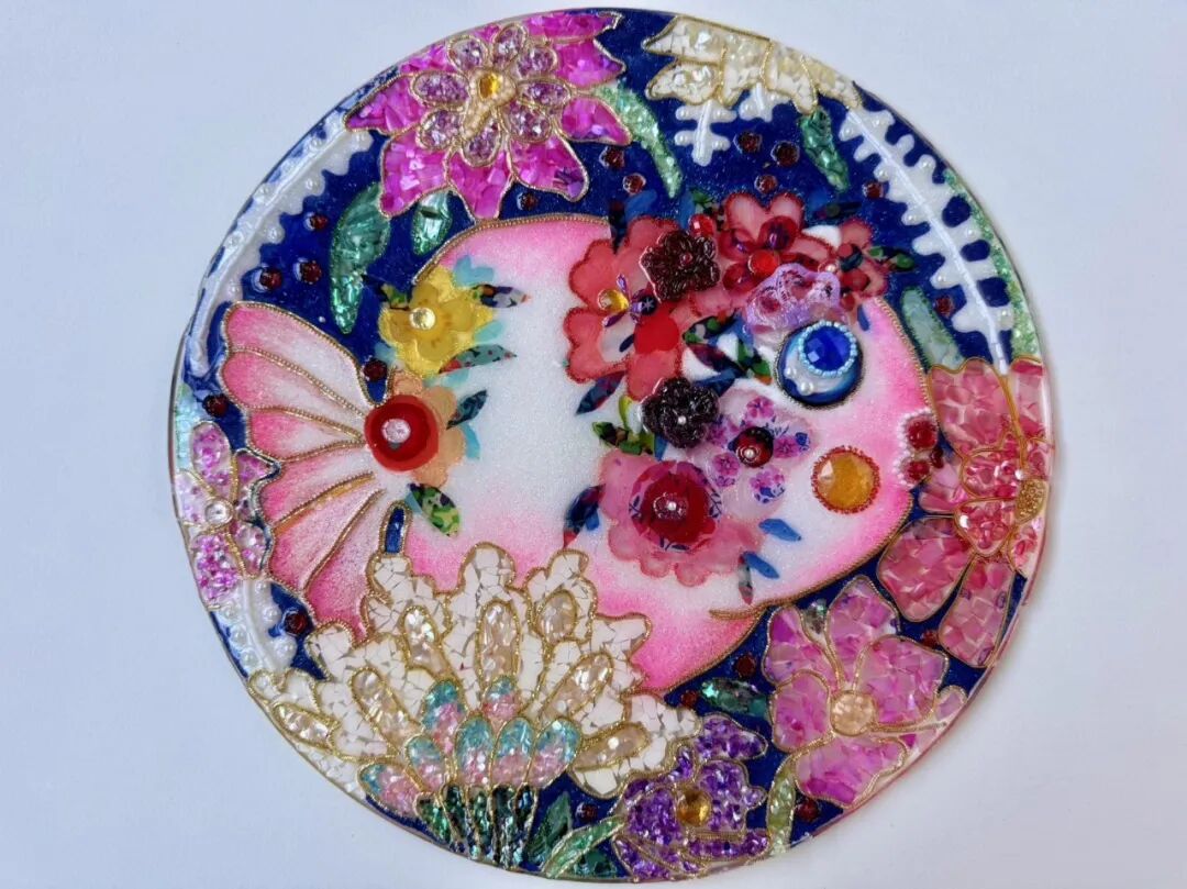 获非遗类别小学组一等奖的作品《快乐的鱼》,出自安亭师范附属小学李佳帝同学之手。作品创作融入了掐丝珐琅和螺钿工艺,结合废弃布料、珠钻、毛线完成,整体色彩斑斓,憨态可掬的小鱼造型灵动,绚丽的构图传递出纯真的童心。执行馆长朱学毅在点评该作品时,讲述了传统技艺的精妙与不易:“掐丝要先将细细的金属丝线捋直,再依图案小心弯折、固定,极其考验耐心,这对于小学生而言,很难得。”