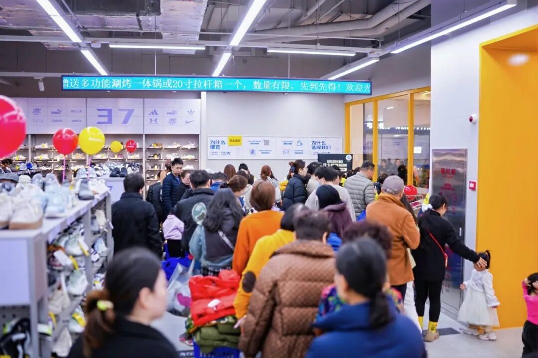 “两双99元”“19.9元起”……开业当天上午,醒目的价格标识迅速吸引了大量顾客涌入。卖场内,人们推着购物车或提着购物篮,沉浸在“寻宝”的乐趣中——鞋靴区,有年轻人仔细比较着运动鞋的款式与舒适度;羽绒服货架前,宝妈认真查看工艺细节……精挑细选后,市民吴小燕购买了几件羽绒服:“综合算下来比线上购买更划算。”