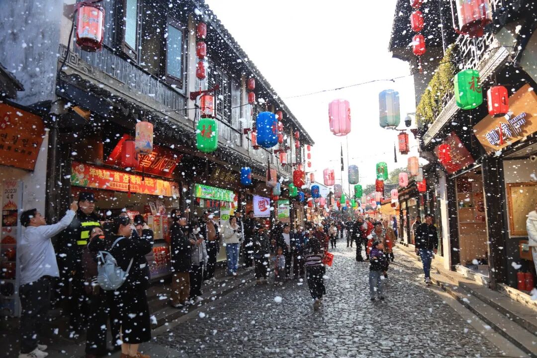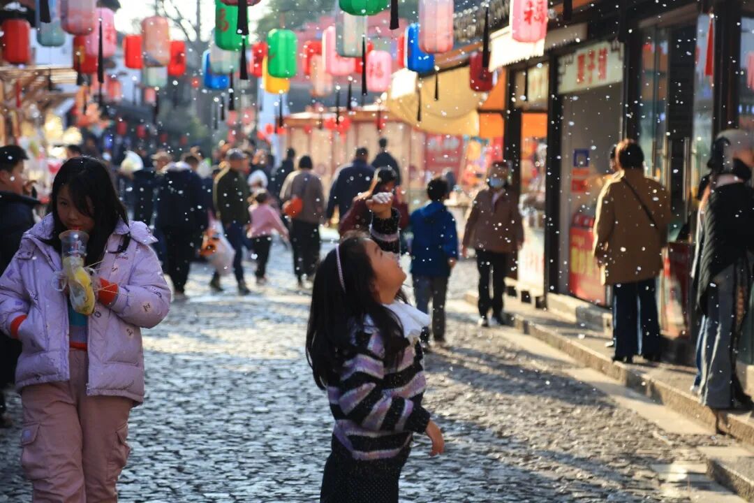 墨香渐散,古镇的节日氛围却未消散。下午4点,人民街上的“双塔映瑞雪”人工降雪活动如约而至。细密洁白的人造雪花从特制设备中喷涌而出,缓缓落在青石板路、翘角飞檐之间。孩子们兴奋地蹦跳着,伸手接住飘落的“雪花”,欢声笑语不绝于耳。“虽然知道是人造雪,但在江南古镇见到这样的景致,还是觉得特别浪漫。”游客王佳乐举起手机,记录下这一幕。