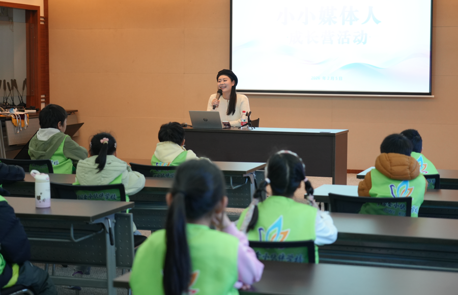 “大家猜猜看,我们的电视塔有多高?”“148米!”在嘉定区融媒体中心演播厅内,主持人齐佩榕以轻松互动的方式向小学员们介绍融媒体中心的整体布局和功能分区,现场气氛活跃。