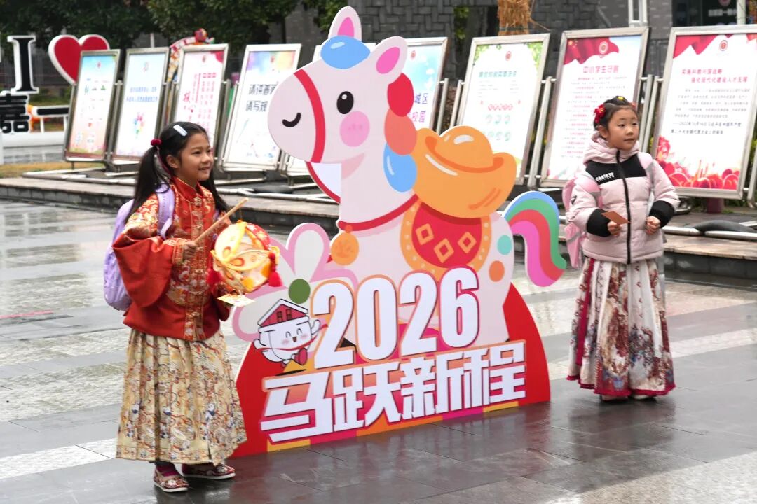 校园内,几处以“马”为主题的打卡墙格外吸睛,吉祥物“嘉乐宝”“嘉和宝”人偶适时与学生们互动,送上新学期的温暖祝福。“今天是新学期开学第一天,我特别兴奋!新的一年,我要好好学习、天天向上!”三年级学生蔡雨汐兴奋地说。