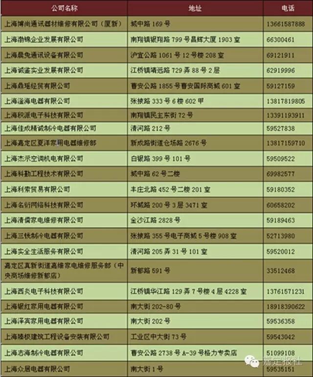日前,小编获悉,嘉定有23家信得过家电维修服务企业分布于全区各镇、街道。其营业地址、联系电话等信息一应俱全。