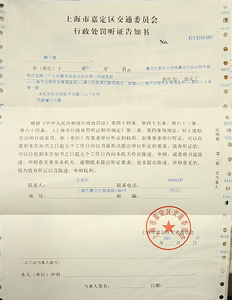 我大队于2021年11月24日、 25日对你作出《上海市嘉定区交通委员会延长行政强制措施决定书》(编号:3212401153)、《上海市嘉定区交通委员会行政处罚听证告知书》(编号:4214101682),因无法直接送达、留置送达及邮寄送达,根据《交通运输行政执法程序规定》第十八条第五项的规定,依法向你公告送达《上海市嘉定区交通委员会延长行政强制措施决定书》(编号:3212401153)、《上海市嘉定区交通委员会行政处罚听证告知书》(编号:4214101682)。请你于本公告发布之日起六十日内前往上海市嘉定区交通委员会执法大队(地址:上海市嘉定区棋盘路1560号)领取《上海市嘉定区交通委员会延长行政强制措施决定书》(编号:3212401153)、《上海市嘉定区交通委员会行政处罚听证告知书》(编号:4214101682),否则,自公告发布之日起经过六十日,即视为送达。