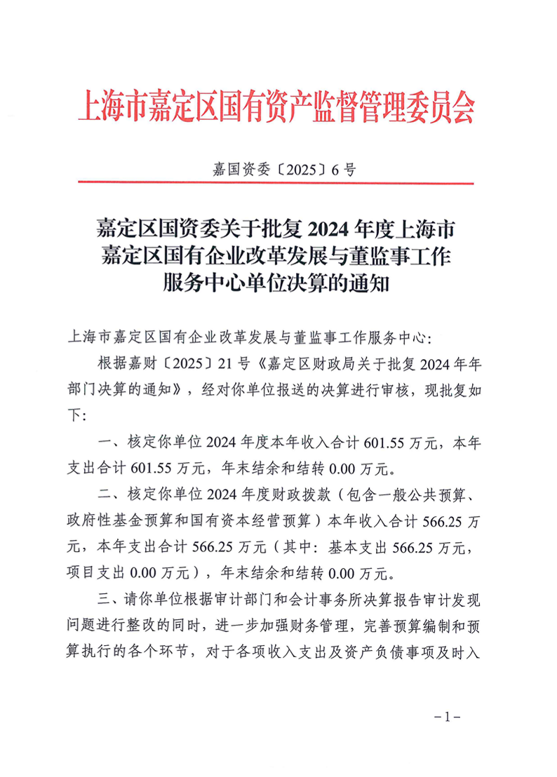 | 名 称: | 嘉定区国资委关于批复2024年度上海市嘉定区国有企业改革发展与董监事工作服务中心单位决算的通知 | ||