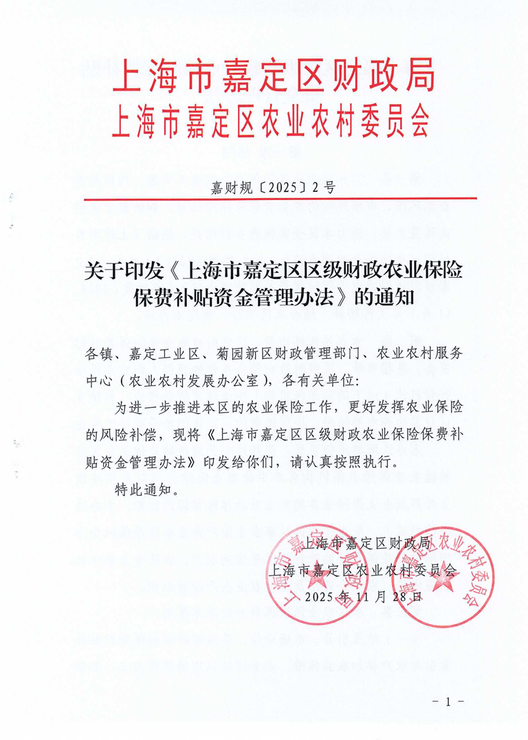 上海市嘉定区区级财政农业保险保费补贴资金管理办法