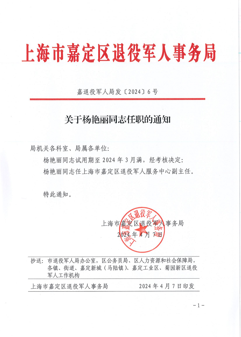 杨艳丽同志任上海市嘉定区退役军人服务中心副主任。
