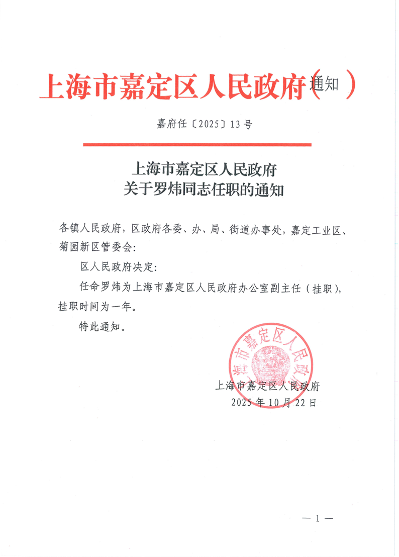 任命罗炜为上海市嘉定区人民政府办公室副主任(挂职),挂职时间为一年。