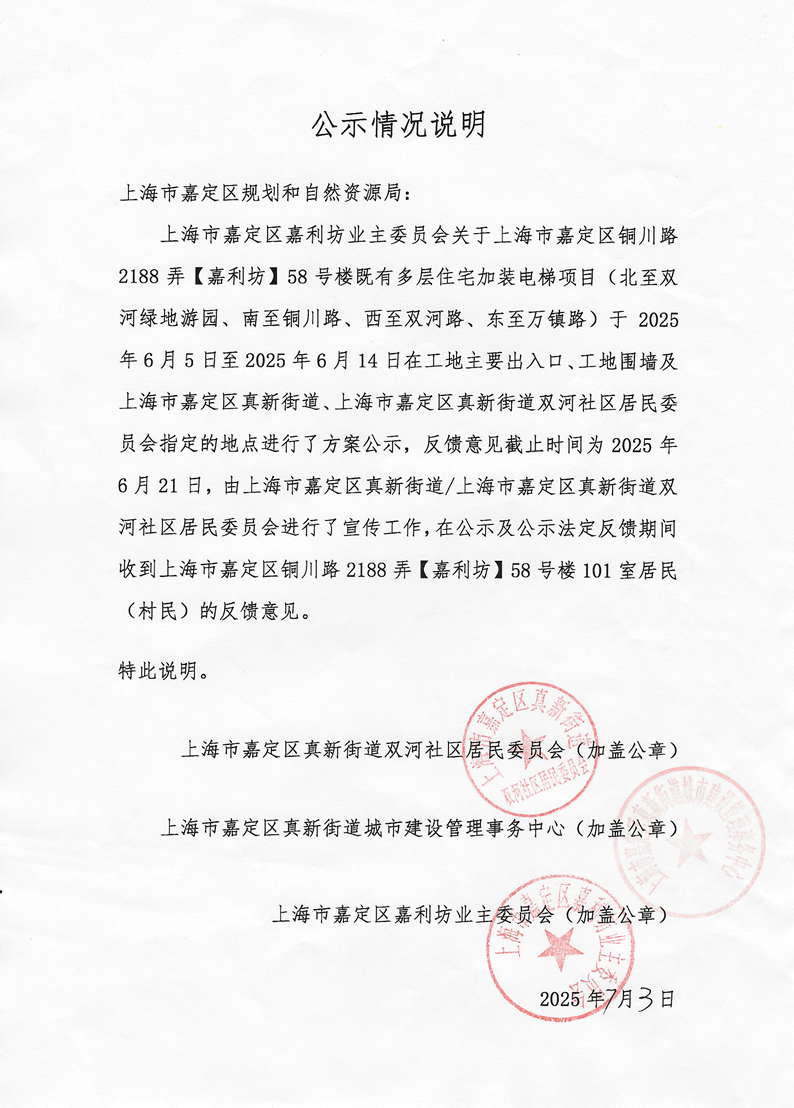 上海市嘉定区铜川路2188弄(嘉利坊)58号楼加装电梯相关资料