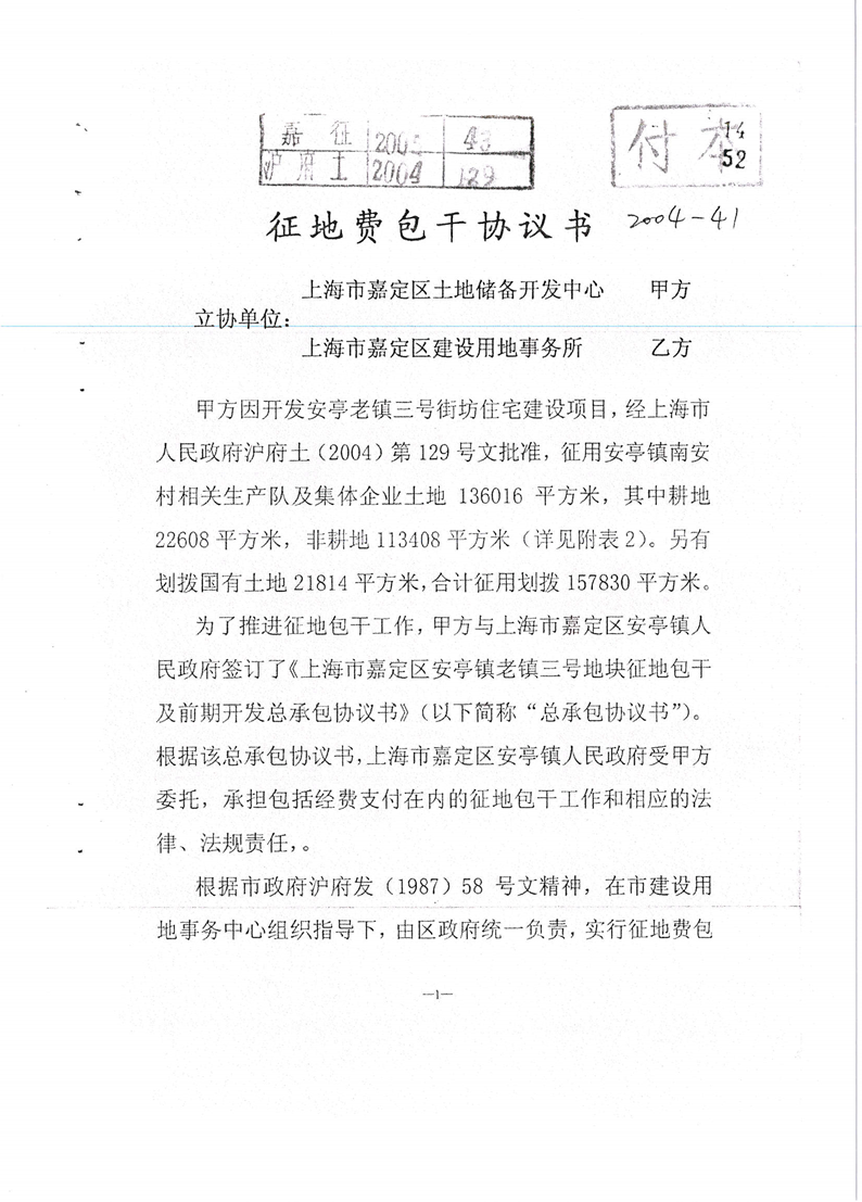 安亭老镇三号街坊住宅建设项目 征地费包干协议书