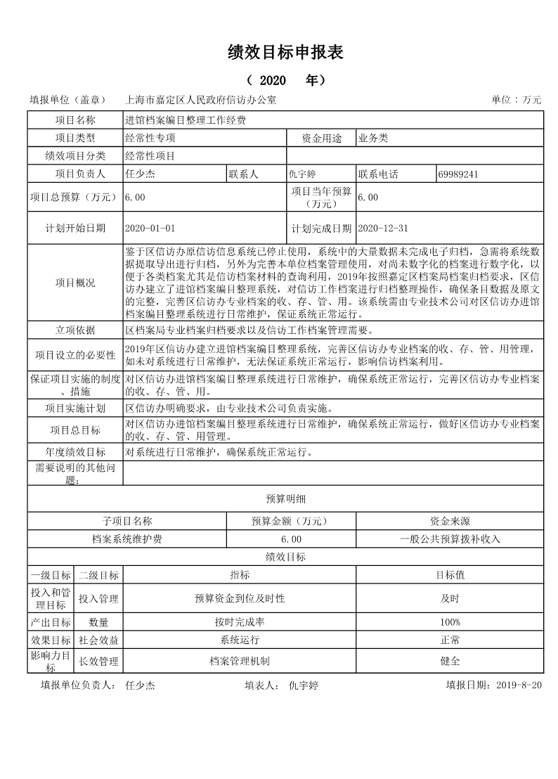 嘉定区人民政府信访办公室2020年绩效目标申报表