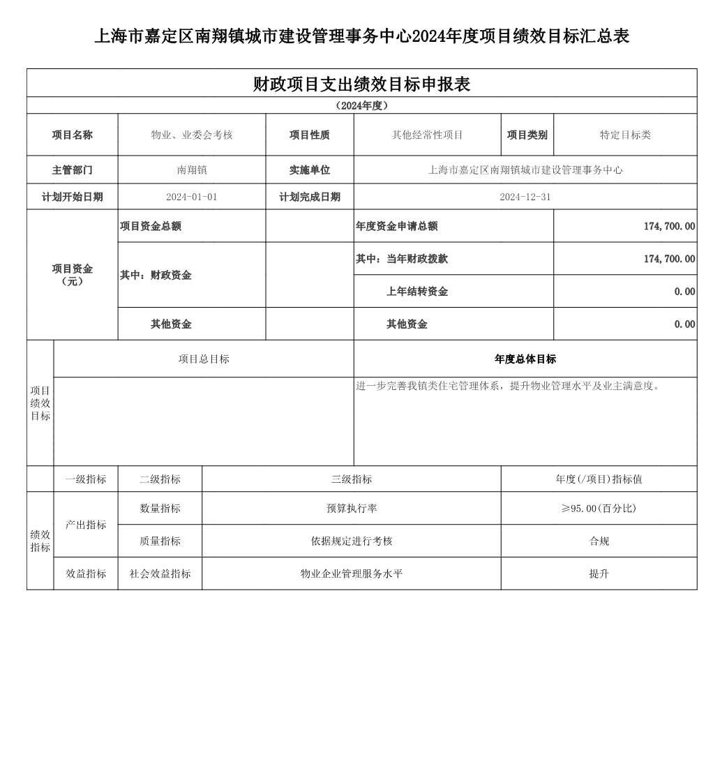 上海市嘉定区南翔镇城市建设管理事务中心2024年度项目绩效目标汇总表