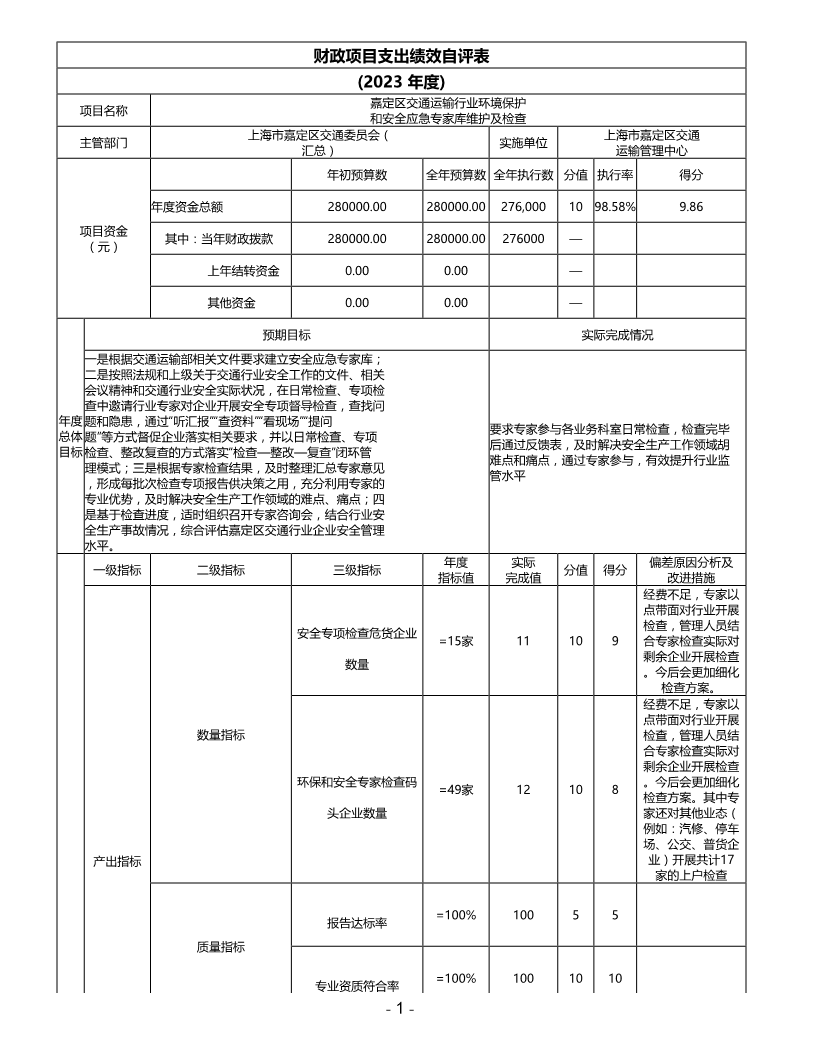 上海市嘉定区交通运输管理中心2023年度项目绩效自评表