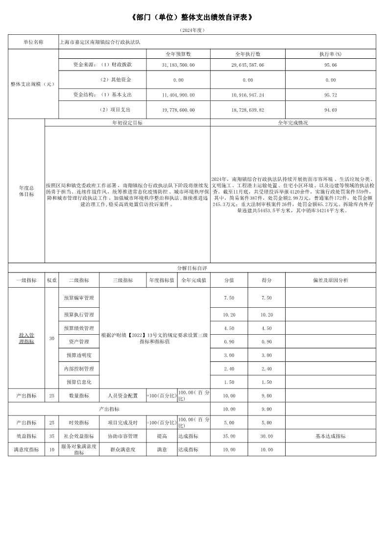 上海市嘉定区南翔镇综合行政执法队 2024年度部门(单位)整体支出绩效自评表