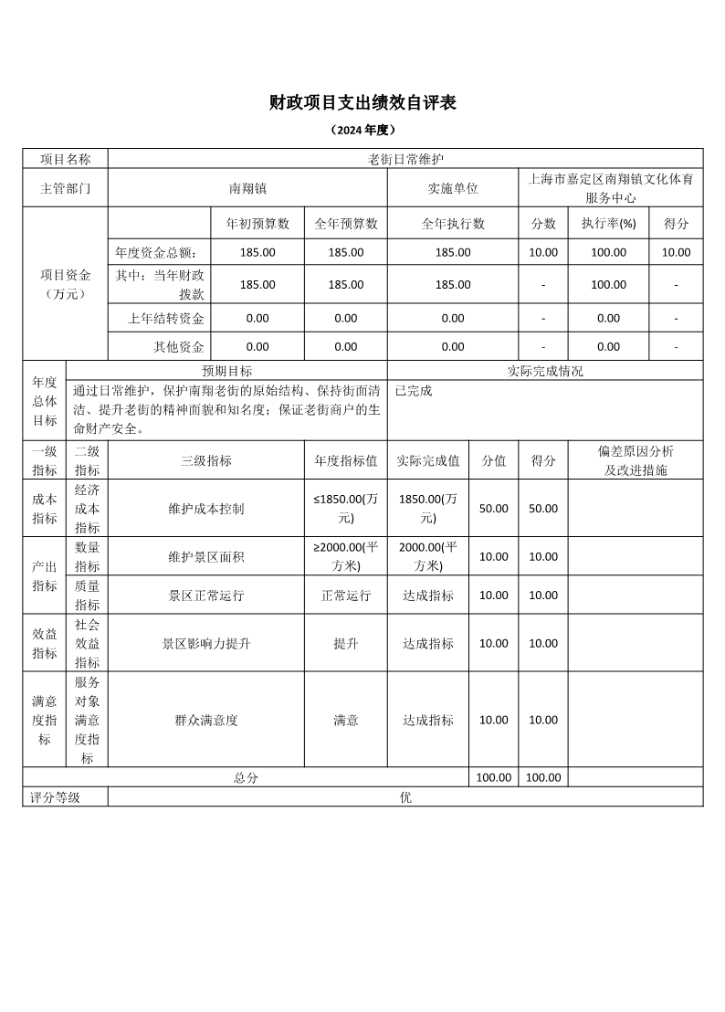 上海市嘉定区南翔镇文化体育服务中心 2024年度项目绩效自评表