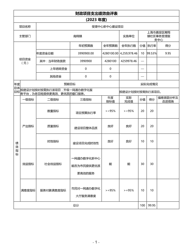 上海市嘉定区南翔镇社区事务受理服务中心 2023 年项目绩效自评价