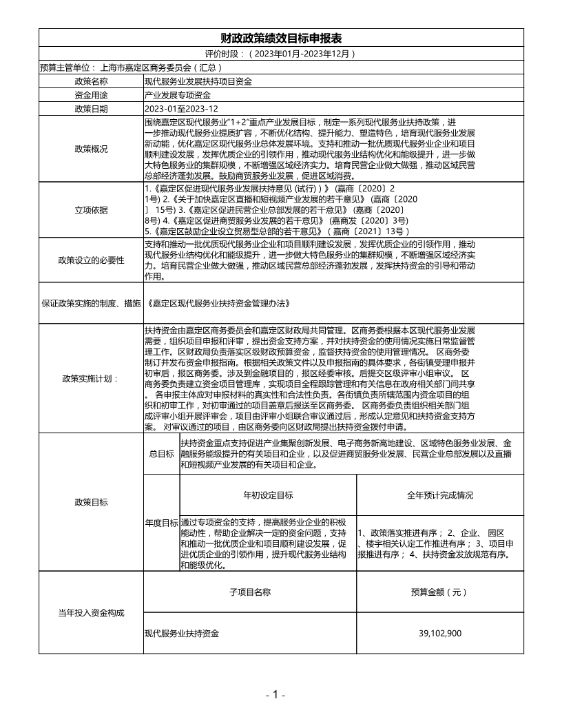 2023年度嘉定区商务委员会财政政策绩效目标表-现代服务业发展扶持项目资金