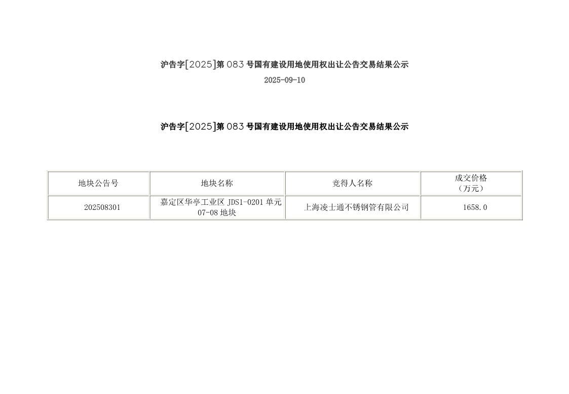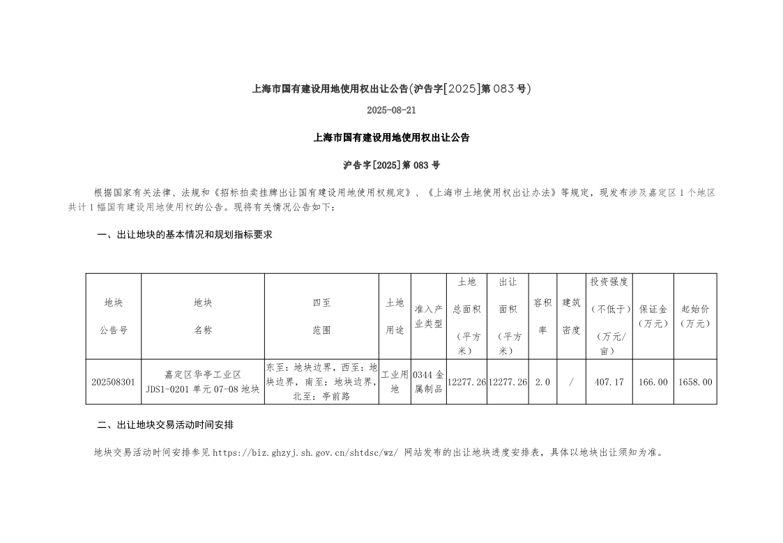 嘉定区华亭工业区JDS1-0201单元07-08地块(沪告字[2025]第083号)国有建设用地使用权出让