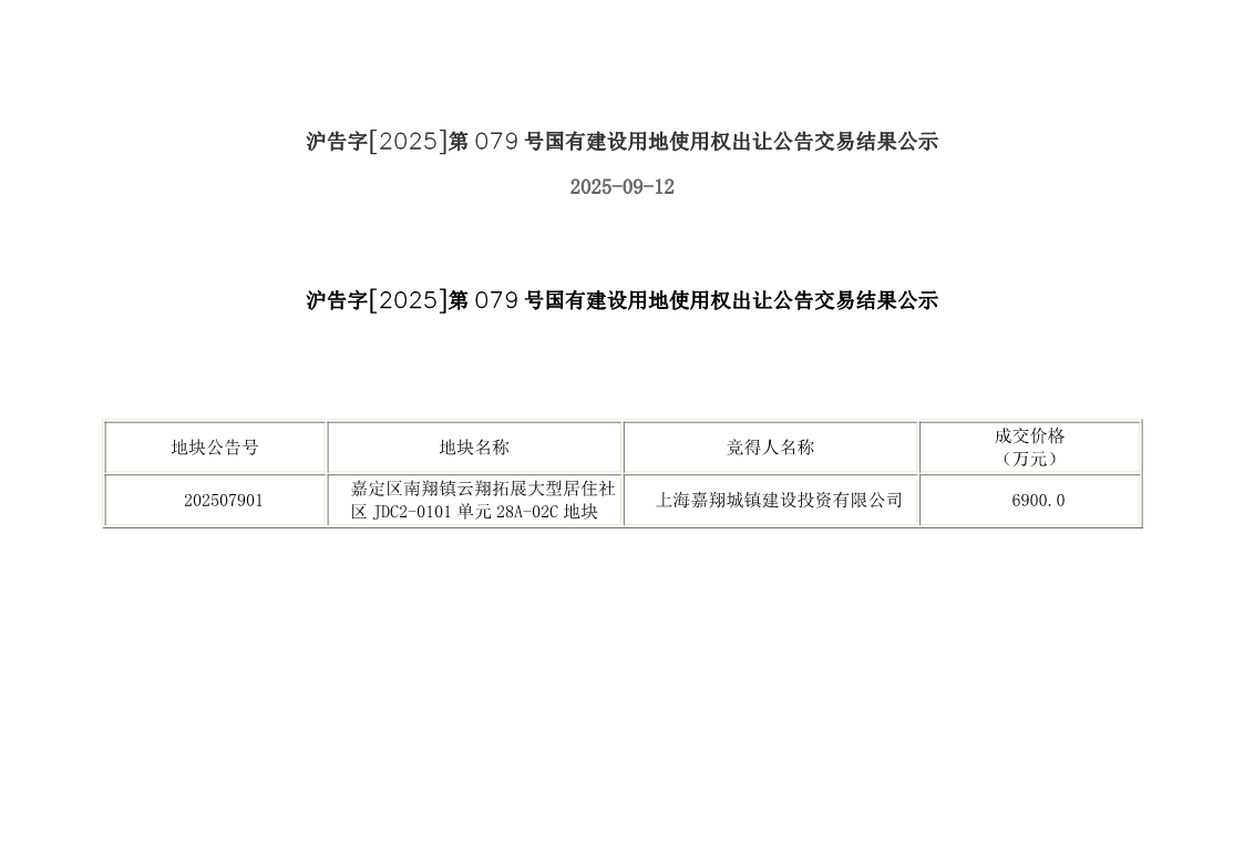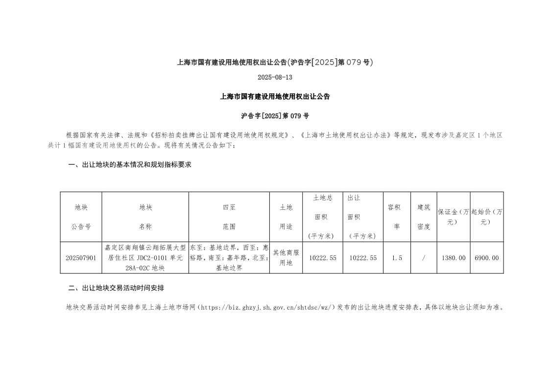 嘉定区南翔镇云翔拓展大型居住社区JDC2-0101单元28A-02C地块(沪告字[2025]第079号)国有建设用地使用权出让