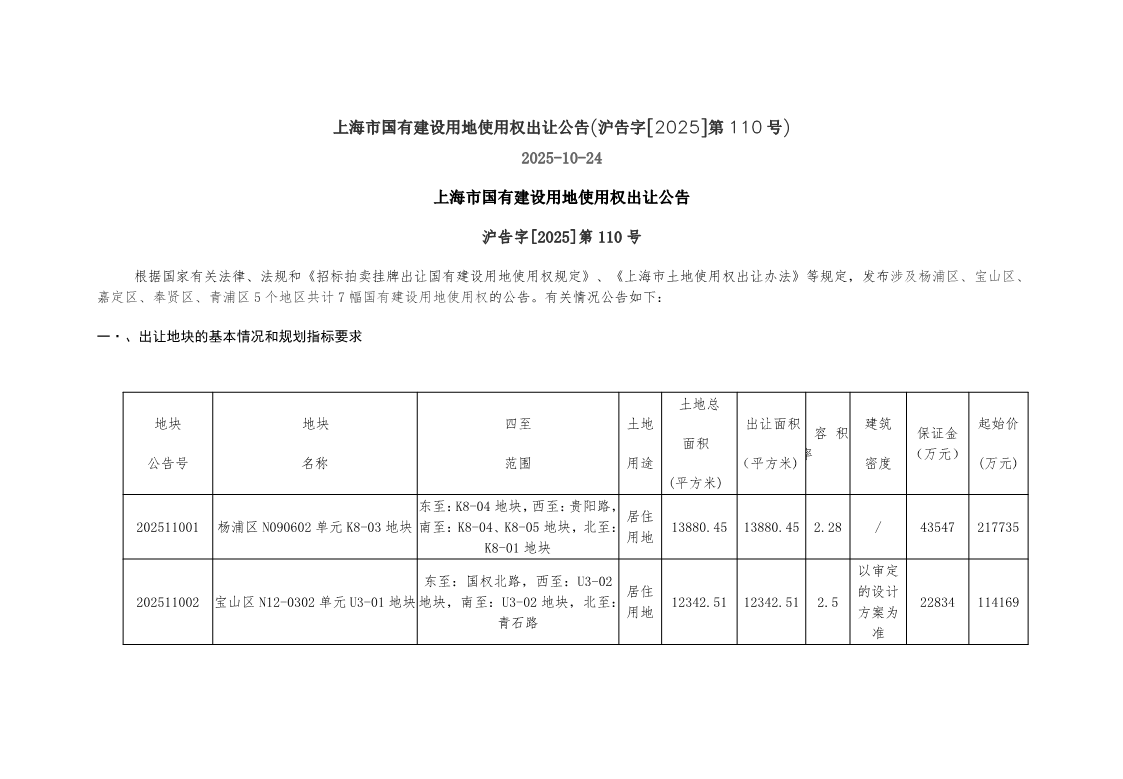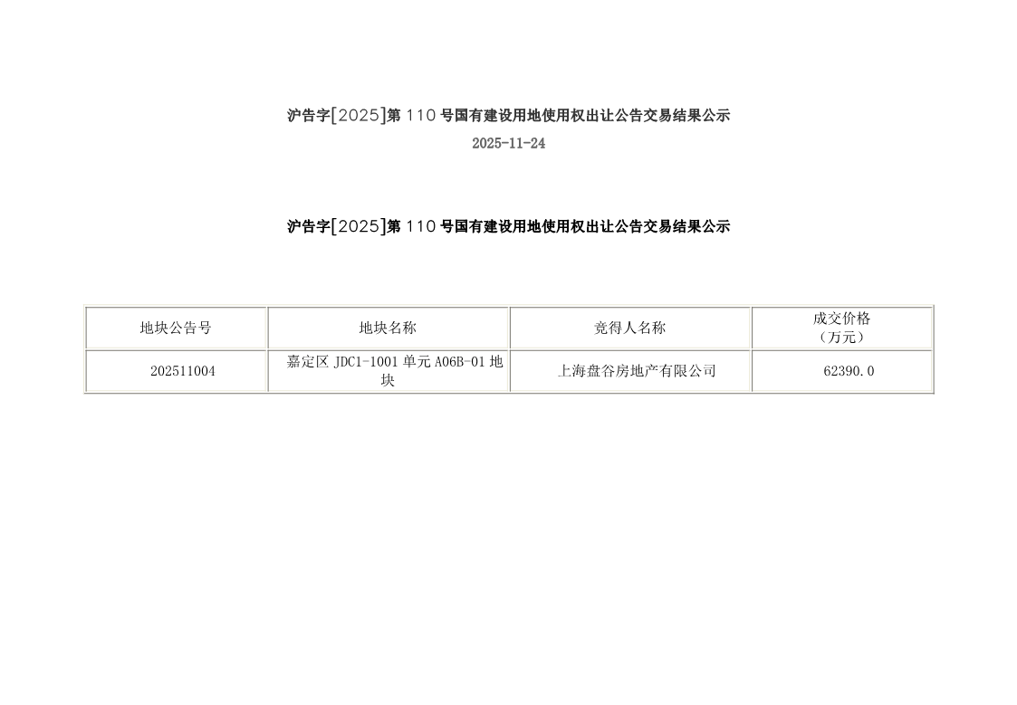 嘉定区JDC1-1001单元A06B-01地块(沪告字[2025]第110号)国有建设用地使用权出让