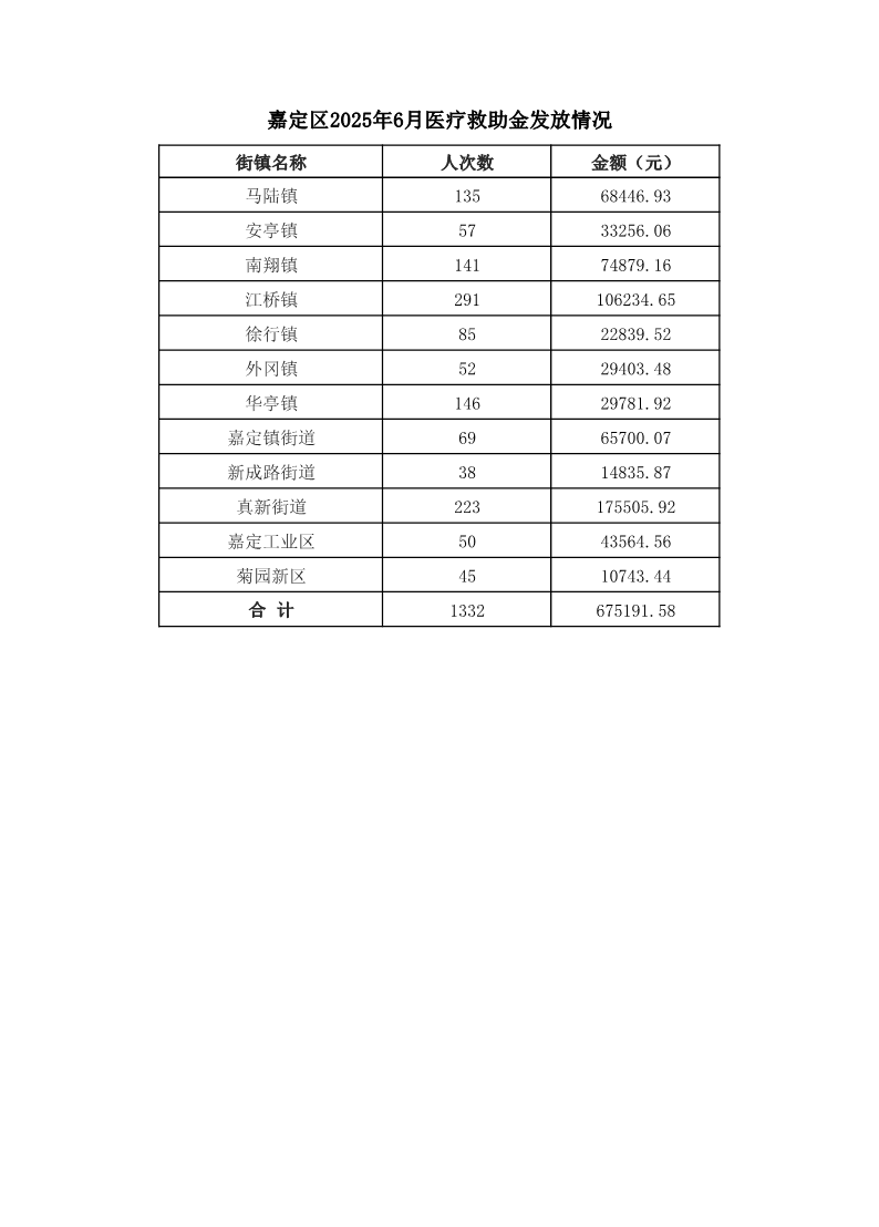 嘉定区2025年6月医疗救助金发放情况