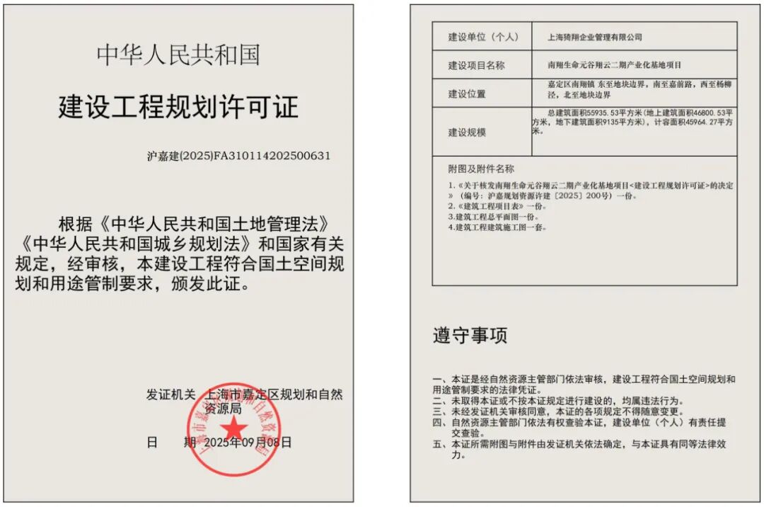 近日,小嘉从南翔镇相关部门了解到,总投资超3.7亿元的生命元谷·翔云科技园二期产业化基地已获得规划许可证,计划于今年第四季度开工建设,2027年底竣工并交付使用。