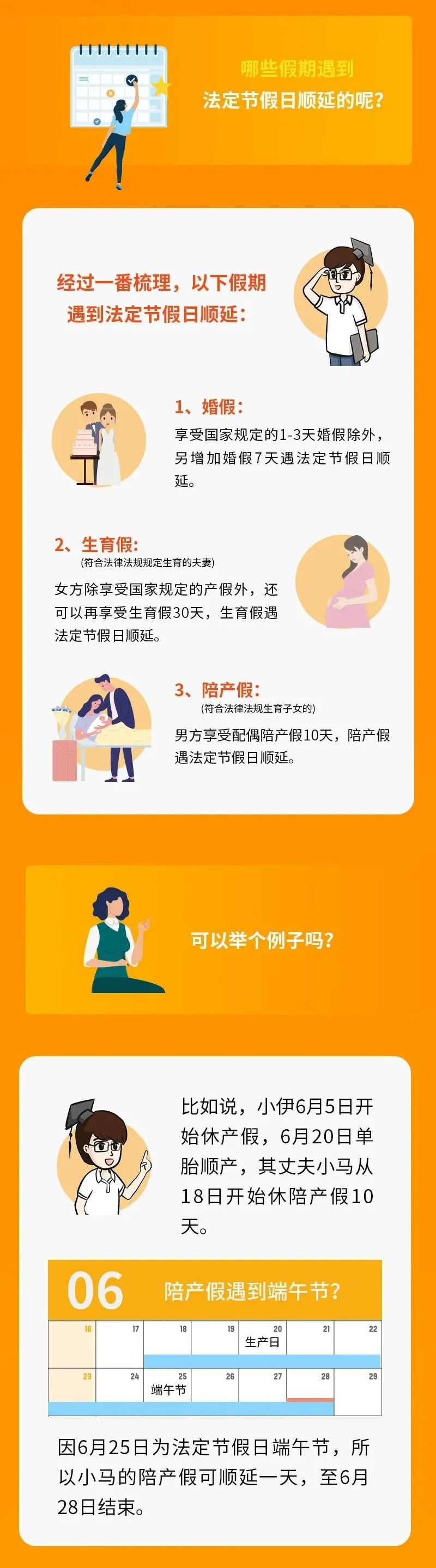 市人社局说,婚假、生育假、陪产假遇到法定节假日可以顺延。一起来看例子吧↓