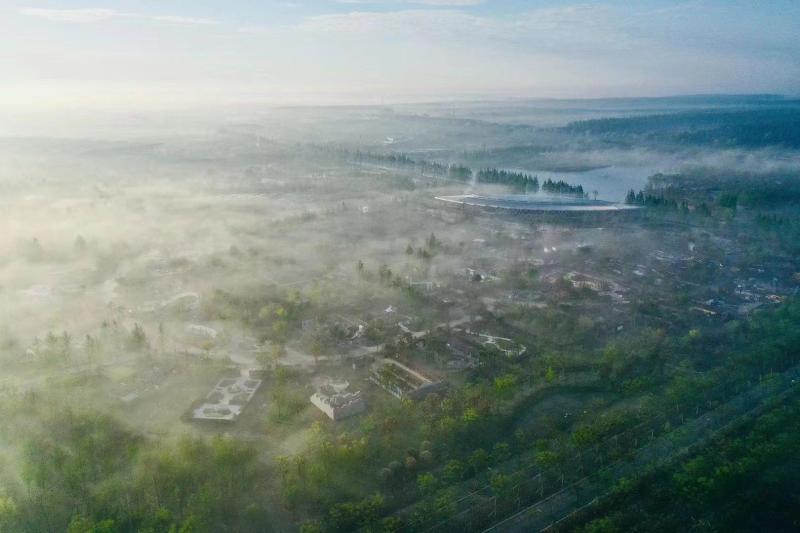 不久前,王华就对着世纪馆拍出了一张“神作”。对航拍作品来说,微微的雾气是营造气氛的加分项,但雾气这种自然条件可遇不可求:有雾的地方,景不一定好;景好的地方,不一定有雾。比如世纪馆,周边水源不多,全天中很难出现浓度合适的雾气。那天清晨,王华让无人机飞到世纪馆上空,激动地发现一团雾笼罩着“彩蝶”,雾团高度很低,“彩蝶”在雾气中若隐若现。“这简直是千载难逢的机遇!当时我太兴奋了,感觉自己明显心跳加快、血往上涌。”