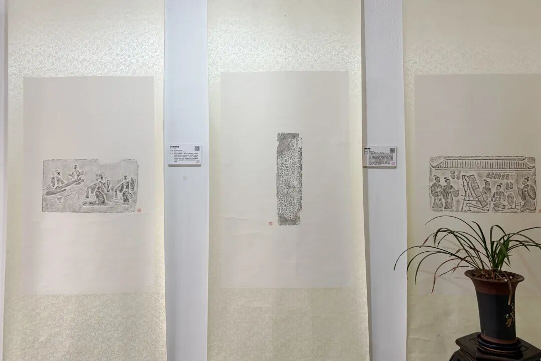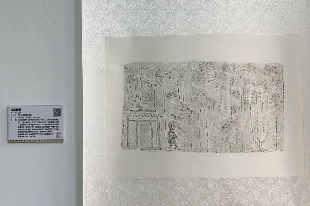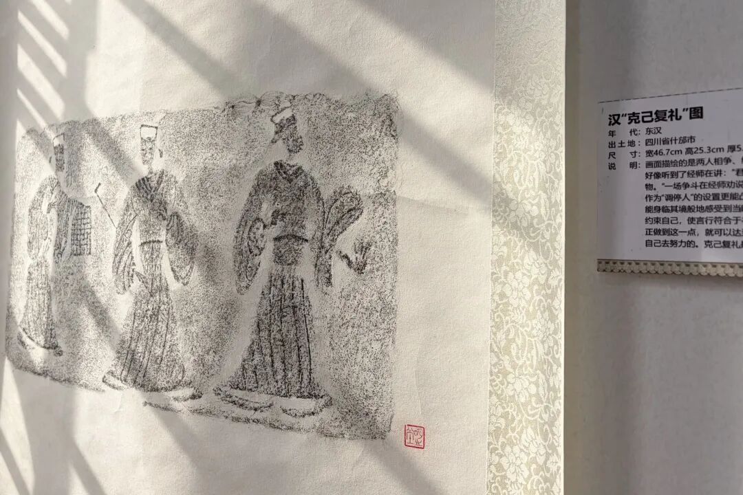 展览现场,一件件珍贵的展品有序陈列着。其中,汉“克己复礼”砖拓图格外引人注目,画面中,三人头戴冠冕、儒服装扮,左侧经师手持简牍,正向右边两人讲经;汉采桑砖拓图则展现了采桑女肩扛长钩,走向屋外桑林的场景……从书籍到古砖,历史和文化在交错融合中,变得更为生动清晰。