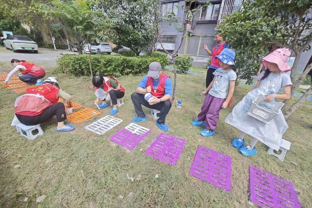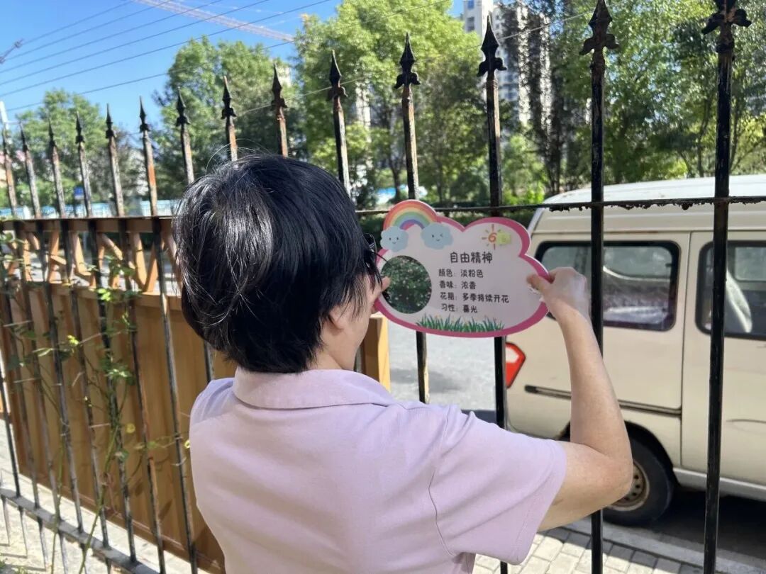 此外,社区还邀请居民、大学生志愿者等群体加入,共同完成草地小道的彩绘与装饰。大家不仅制作了社区风采展板,还为每一株月季贴上专属说明板,清晰标注品种、生长习性与养护要点,让月季花墙不仅成为社区美景,更化作科普与交流的生动课堂。