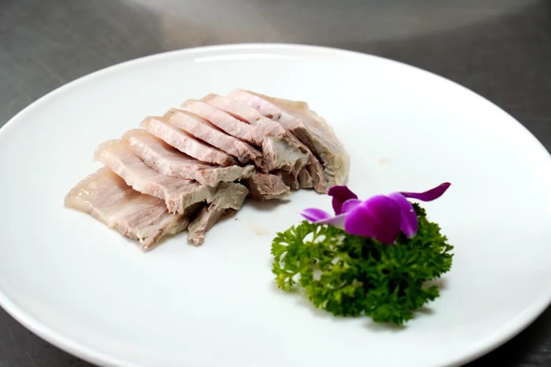 12月12日下午,在沥江生态园的厨房里,厨师李结华正用一块新鲜的五花肉烹制这道传统美味。李结华表示,用最简单的烹饪方式,只需将本地梅山猪肉放入清水中,大火煮沸后转小火焖煮约四十分钟,取出切片,佐以少许酱油,便可成就一盘肉皮透亮、入口嫩滑的佳肴。“一定要选品质上乘的猪肉,再采用白切的做法才能最大限度地激发出肉本身的香味和软糯口感。”李结华说。