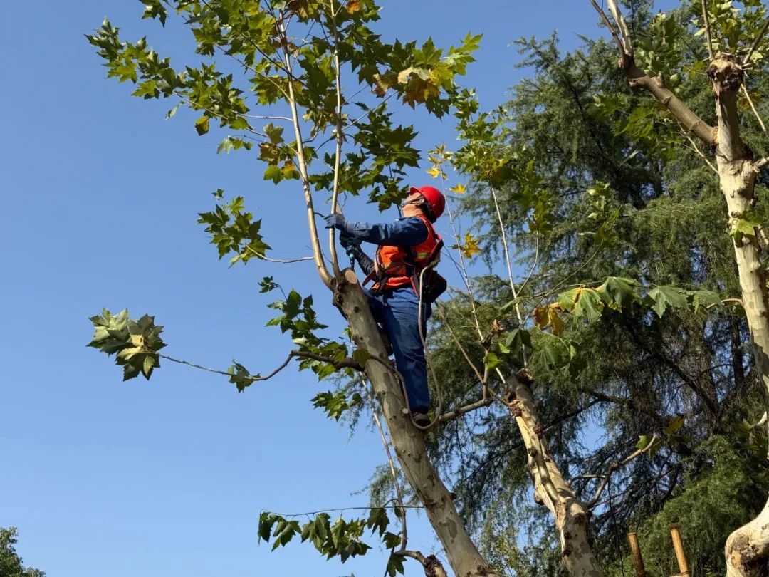 在叶城路上,上树工们已经穿戴好防护装备,手持手锯、电动手锯,对树木进行修剪整形,并在断枝处涂抹伤口愈合剂。对于交通指示牌和路灯周围的树木,工人们也会提前清理,确保这些设施不被遮挡。