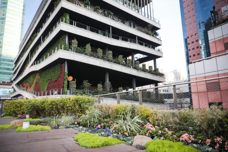 徐家汇连廊“城市阳台和休闲广场”的设计理念,显然迎合了这样的大众诉求。2020年底徐家汇连廊一期正式开放,除了实现汇联商厦、T20大厦、美罗城、太平洋数码二期和现有徐家汇天桥无缝衔接,它还被建成了一处兼具丰富自然元素与通行功能的人性化空间。大片开放式绿化嵌入连廊中,随处可见的休闲座椅,让人可以停下来感受城市立面。