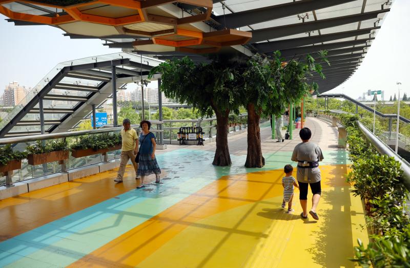 上月17日刚刚开通的新江湾城三门路空中连廊,从高空俯瞰,不规则五边形如同一颗钻石,因而被誉为“钻石连廊”。其不仅以步行楼梯、双向扶梯、垂直电梯、穿越绿化的曲径坡道、宽阔的阶梯景观平台等多种形式,同附近的办公楼、街区、绿化等高度融合在一起,还承担延续城市绿轴的功能,把淞沪路、闸殷路、三门路形成的五岔路口处割裂的城市绿化连接起来,形成一个亦静亦动的慢行空间。